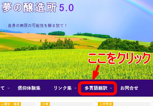 この度、Google翻訳へのリンクを使い、多言語翻訳機能を追加しました。トップページの横に並んでいるメニュー内の「多言語翻訳」を(「翻訳 Translate」に変更しました)クリックすると、翻訳されたページにジャンプします。
