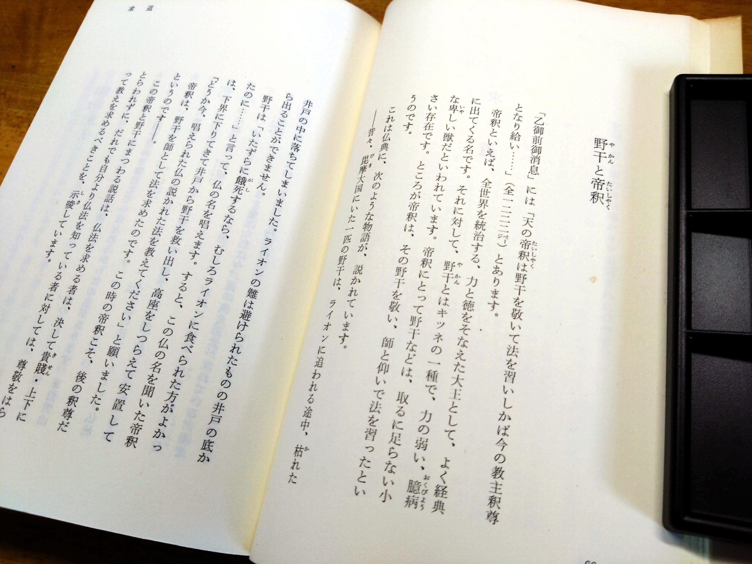 帝釈といえば、全世界を統治する、力と徳をそなえた大王として、よく経典に出てくる名です。それに対して、野干(やかん)とはキツネの一種で、力の弱い、臆病な卑(いや)しい獣だといわれています。帝釈にとって野干などは、取るに足らない小さい存在です。ところが帝釈は、その野干を敬い、師と仰いで法を習ったというのです。これは仏典に、次のような物語が、説かれています。