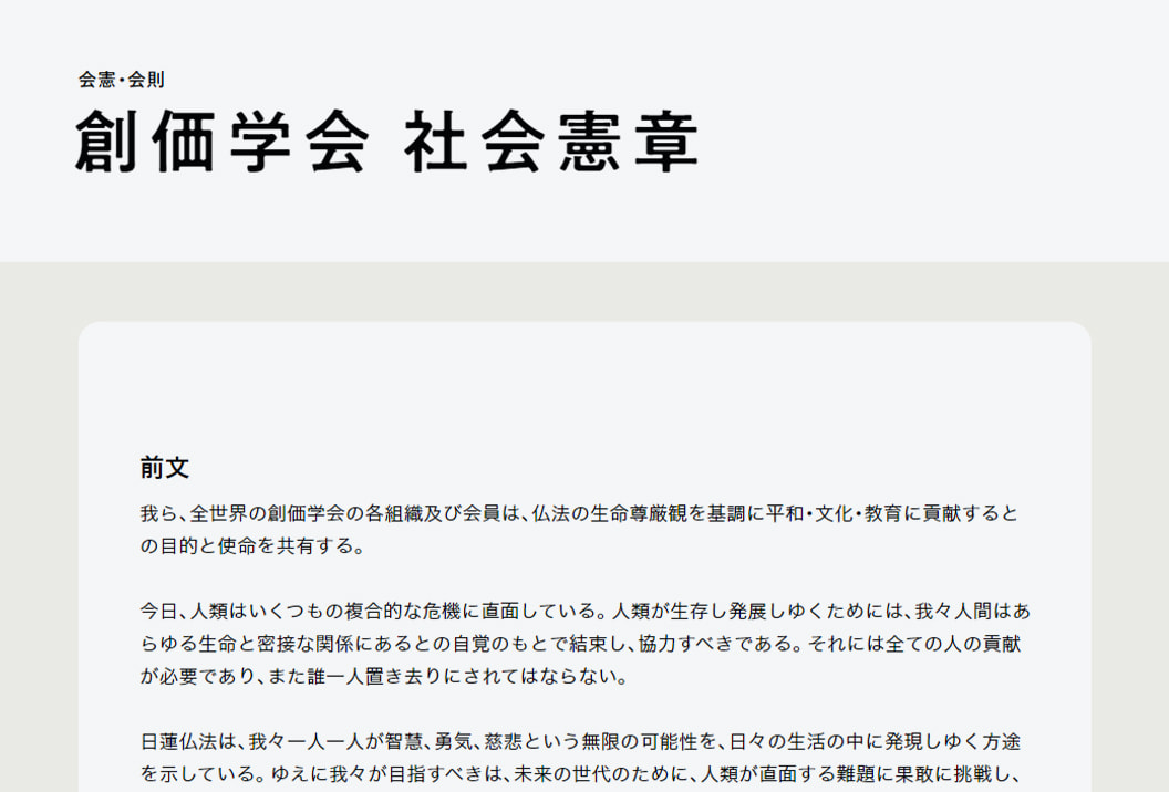 末尾に、「創価学会会憲」と「創価学会社会憲章」のリンクカードを張ります。この2つは、学会が目指すもの、あるべき姿、社会におけるあり方、などを要約して述べており、内外を問わず、非常に有用で参考になると思います。